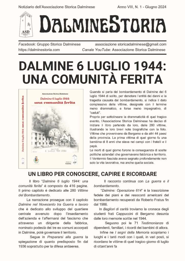 E’ on line il nuovo numero del notiziario dell’Associazione Storica Dalminese dedicato all’80mo anniversario del bombardamento di Dalmine. E’ dedicato alla presentazione delle tre iniziative editoriali da noi promosse per l’occasione. 1. Dalmine 6 luglio 1944: una comunità ferita – 2. Bagliori di carità tra le rovine dell’incursione. Testimonianze degli studenti frati Cappuccini di Bergamo – 3. “Dalmine: Operazione 614” (video restaurato e aggiornato)